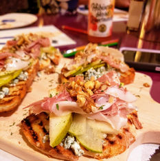 CHARCUTERIE PALETTE $20 Italian Salami, Soppressata, Prosciutto, Brie, Aged Cheddar, Seasonal Choice, Jams/Honey, Seasonal Fruit, Toasted Baguette